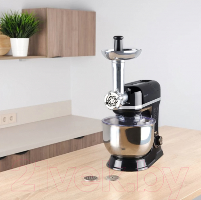 Мощность: 1200 Вт; Объем чаши: 5 л; Материал чаши: нержавеющая сталь ; Мясорубка: есть ; Количество скоростей: 6 ;