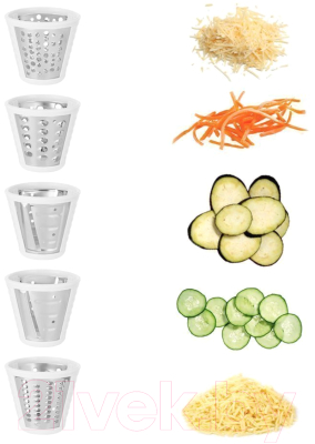 - Шинковка и нарезка: комбайны снабжены насадками для нарезки кубиками, соломкой, ломтиками и даже теркой.
